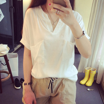 女裝寬松休閑口袋棉麻襯衫短袖V領(lǐng)套頭純色亞麻襯衣 /