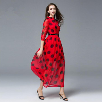 歐洲站2016春裝新款歐美時尚波點印花飄逸優雅長款連衣裙 /