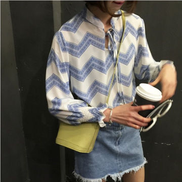 2016夏季新款小清新燈籠袖打底衫女韓版雪紡印花波浪條紋長袖上衣 /