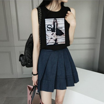 韓國2016夏季新款韓版顯瘦無袖T恤牛仔百褶半身裙套裝連衣裙 /