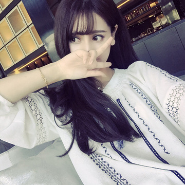韓系甜美七分袖鏤空民族風刺繡娃娃衫襯衫女 /