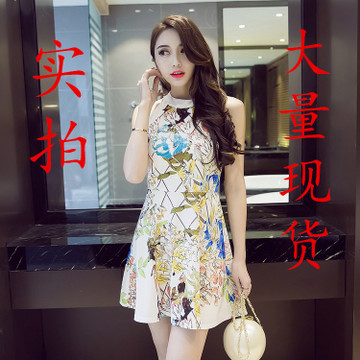 2016實拍夏季名媛性感掛脖露肩印花高腰修身顯瘦背心連衣裙 /