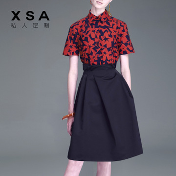 短袖套裝裙女士?jī)杉?016夏季新款襯衫中裙印花套裝 /