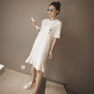 夏季新款女韓版中長款刺繡字母圓領荷葉邊棉質T恤 /