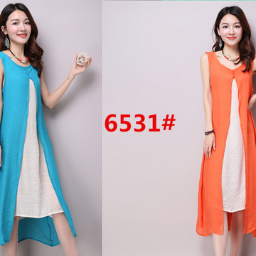 實拍 2016棉麻寬松大碼無袖背心連衣裙 文藝民族風假兩件套 /