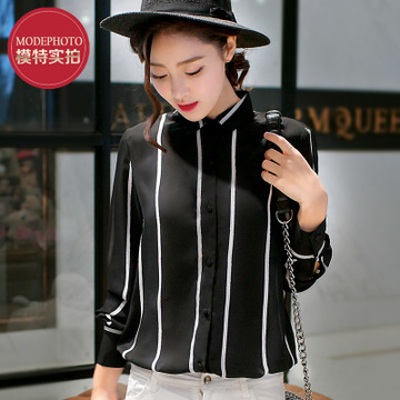 實(shí)拍 2016春款韓版修身黑白條紋雪紡襯衫女長(zhǎng)袖顯瘦襯衣上衣 /