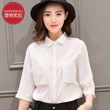 現(xiàn)貨實(shí)拍 韓版文藝寬松大碼中袖襯衫 休閑純色襯衣女 /