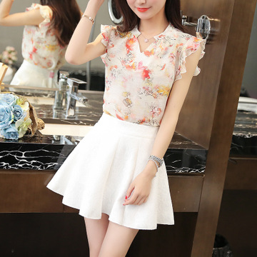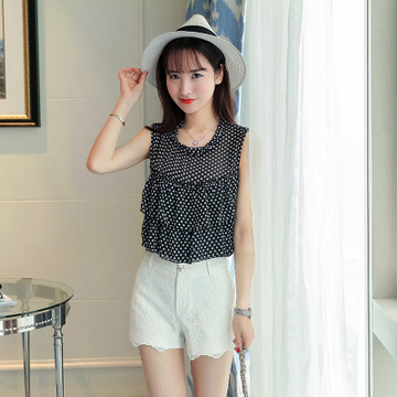 2016女裝春款新款女裝韓范無袖波點雪紡衫蕾絲短褲子兩件套套裝 /