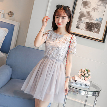 2016女裝春款韓版時尚短袖修身顯瘦中長款蕾絲網紗百褶皺連衣裙 /