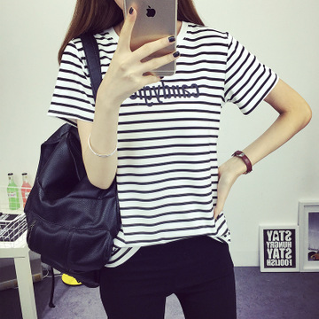 一件代發女裝2016韓版夏裝新款條紋T恤短袖寬松打底衫批發網貨源 /
