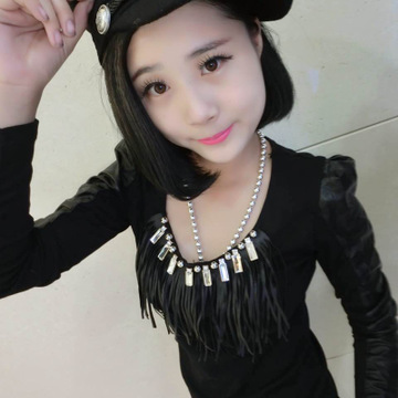 2016歐洲站春季加厚螺紋棉拼皮長袖打底衫 /