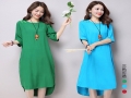 2016夏季新款女裝原創復古短袖竹節棉麻中裙連衣裙長裙 /