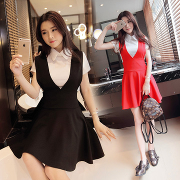 2016夏季新款女裝襯衣修身顯瘦背帶連衣裙短袖兩件套套裙 /