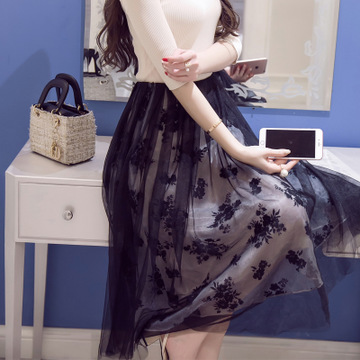 D實拍韓版現貨 夏季新款 網紗歐根紗植絨中長裙半身裙 /
