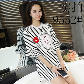 實拍2016夏新款女裝韓版自制紅唇字母貼布條紋T恤連衣裙 /