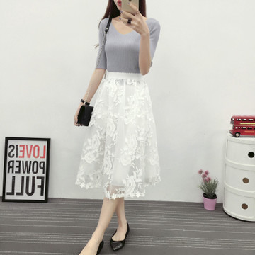 2016春夏新款韓版中長款蕾絲花朵半身裙高腰長裙歐根紗蓬蓬裙 /