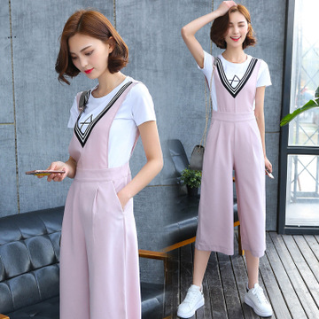 實拍2016夏裝新款韓版拼色連體闊腿褲套裝t恤兩件套背帶裙褲女 /