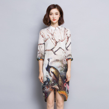 實拍2016春裝新款優雅真絲印花不規則裙七分袖立領連衣裙女 /