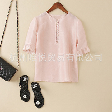2016新款 歐美時尚減齡范 唯美荷葉袖 絲麻 圓領多扣襯衫上衣女 /