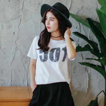 實拍2016夏裝新款女裝數字圖案簡單韓版休閑T恤上衣 純棉短袖女 /