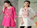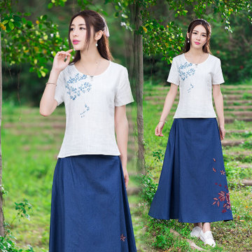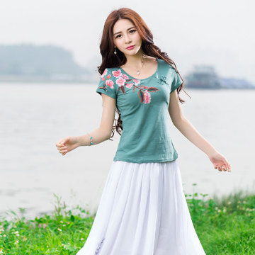 6894 新款女裝民族風 花瓣領中袖繡花棉麻寬松T恤上衣襯衣 /