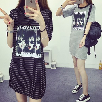2016夏季中長款純棉打底衫女印花短袖T恤大碼寬松條紋t恤裙女學(xué)生 /