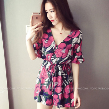 2016夏裝新品V領碎花雪紡連體褲韓版時尚收腰顯瘦短褲女一件代發 /