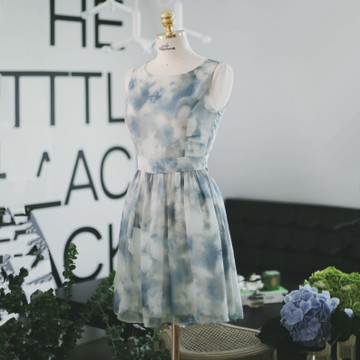 2016年夏季韓國官網韓版水墨露背綁帶系扣修身印花雪紡連衣裙 /