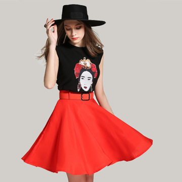 歐洲站 2016夏季太陽花珠片繡花上衣+大擺網紗短裙兩件套連衣裙 /