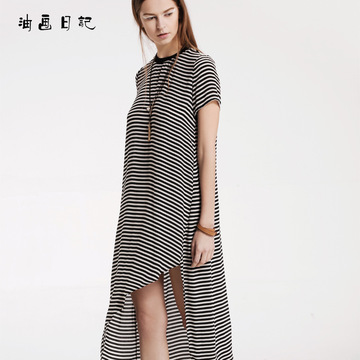 油畫日記2016原創女裝連衣裙長款百搭寬松休閑條紋圓領短袖純棉 /