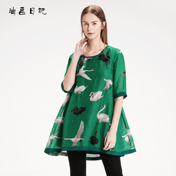 油畫日記2016女裝原創夏裝精品連衣裙寬松大擺印花絲麻盤扣短袖 /