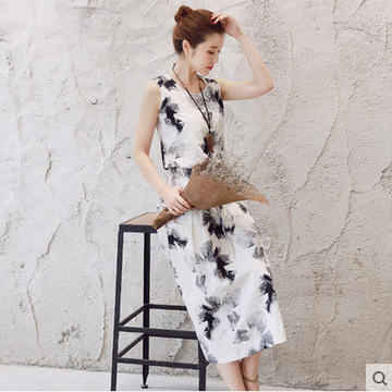 2016女春夏新款棉麻連衣裙短袖套裝裙文藝復(fù)古印花兩件套長裙 /
