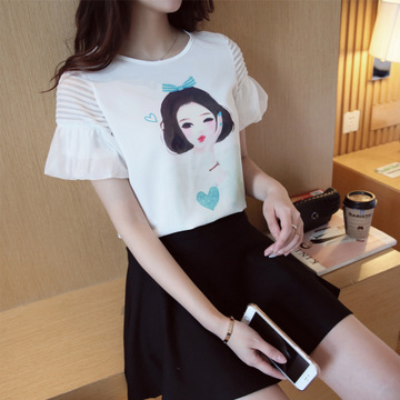 2016夏裝新款韓版泡泡袖女孩印花雪紡衫打底衫上衣女一件代發 /