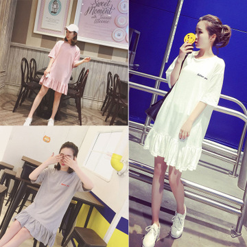 2016夏季新款 學(xué)院風(fēng)圓領(lǐng)寬松短袖刺繡下擺百褶連衣裙 F02 /