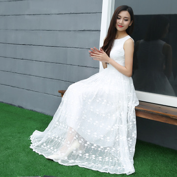 2016實拍夏季蕾絲繡花超仙女大擺無袖海邊沙灘公主連衣裙長款裙女 /