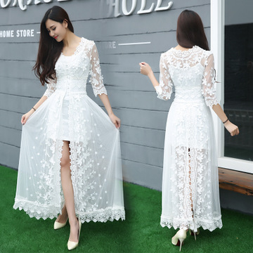 2016開叉立體繡花白色蕾絲網紗連衣裙女長裙兩件套淑女長裙女正品 /