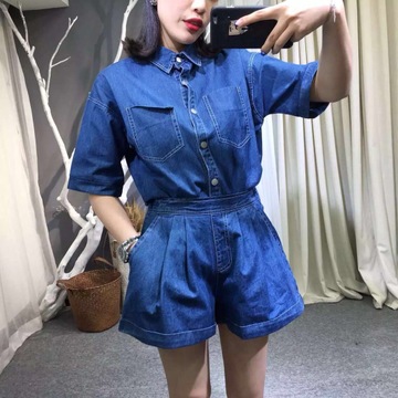新款超級(jí)顯瘦松緊腰頭不挑人穿的牛仔襯衫短褲牛仔套裝女 /
