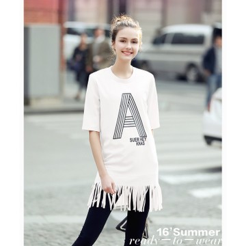 2016春夏新款字母印花五分短袖t恤女寬松百搭流蘇下擺體恤連衣裙 /