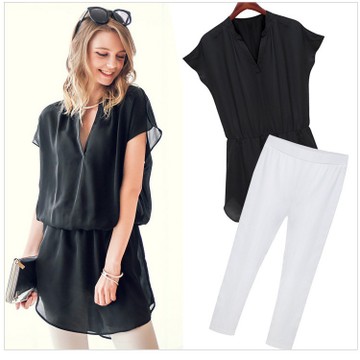 2016歐美新款大碼女裝V領(lǐng)短袖雪紡上衣7分褲胖mm休閑套裝夏 /