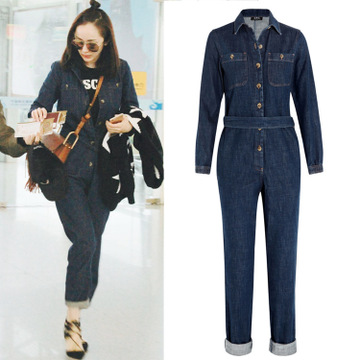 2016夏裝明星楊冪機場同款BF牛仔連體褲女長袖寬松連衣褲工裝褲 /