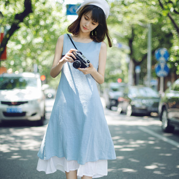 米尚潮流女裝無袖連衣裙夏森女連衣裙女長款棉麻裙寬松系帶裙 /
