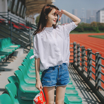 米尚潮流女裝夏裝新款純棉白襯衫女韓范打底衫短袖寬松大碼白襯衣泡泡袖 /