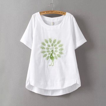 米尚潮流女裝森女民族風寬松棉麻繡花孔雀開屏短袖T恤夏裝顯瘦上衣女學生 /