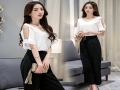 實拍 2016夏裝新款韓版修身顯瘦露肩上衣闊腿褲兩件套 /