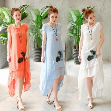2016夏新棉麻連衣裙中長款大碼文藝印花寬松顯瘦雙層不規則裙 /
