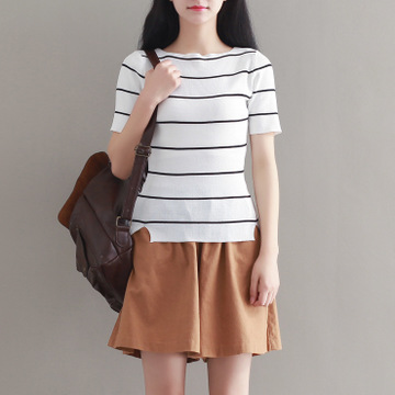 新款修身百搭針織短袖T恤女裝條紋打底衫一字領上衣文藝 /