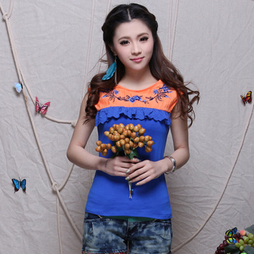 特價(jià)款 民族風(fēng)新款女裝全棉圓領(lǐng)修身花邊拼繡花短袖T恤打底衫 /