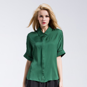 夏季新款翻領純色桑蠶真絲襯衫中袖鏤空T恤上衣女短款學生女開衫 /