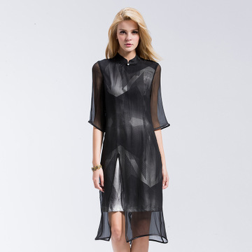 夏新款立領純黑色透視袖真絲修身連衣裙開叉假兩件復古風改良旗袍 /