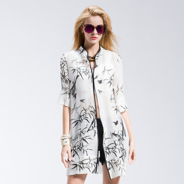 2016夏季中長款真絲開衫復古立領五分袖竹子印花桑蠶絲防曬衣 /